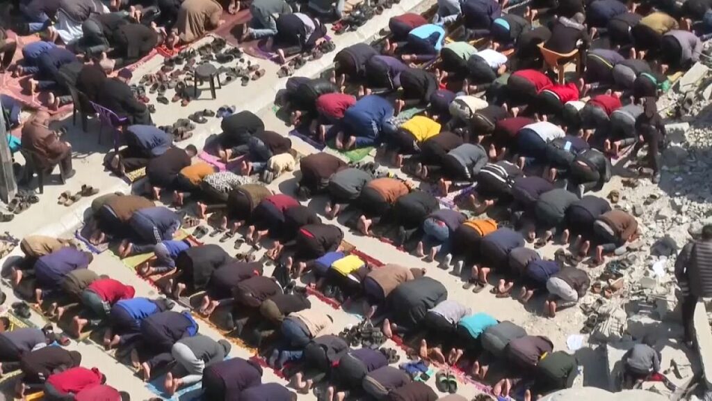 وفي رفح، تجمع المصلون، بينهم أطفال، لأداء صلاة الجمعة وسط أنقاض مسجد الفاروق.