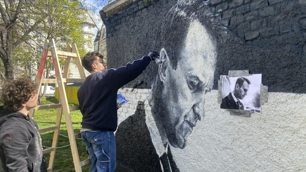 الجدار كان مطلياً باللونين الأزرق والأصفر للعلم الأوكراني، منذ بدء الغزو الروسي عام 2022، والآن تتصدره رسمة لأليكسي نافالني الذي كان يعتبر من أشرس المعارضين للكريملين، قبل أن يلقى حتفه في سجن الدائرة القطبية الشمالية في منطقة يامال حيث كان يمضي حكماً بالسجن 19 عاماً، ما أثار موجة تنديد دولية واسعة.