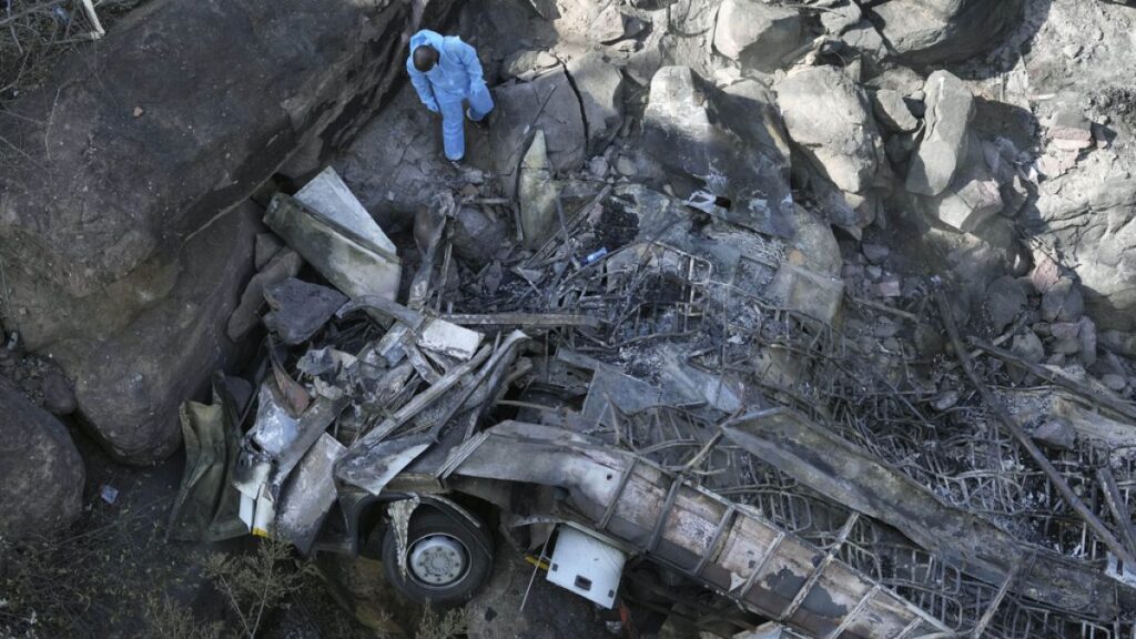 وقالت السلطات إن النيران اشتعلت في الحافلة حين اصطدمت  بأرض صخرية، مما أسفر عن مقتل 45 شخصاً على الأقل، ويتلقى الناجي الوحيد، وهو طفل يبلغ من العمر 8 سنوات، رعاية طبية من إصابات خطيرة.