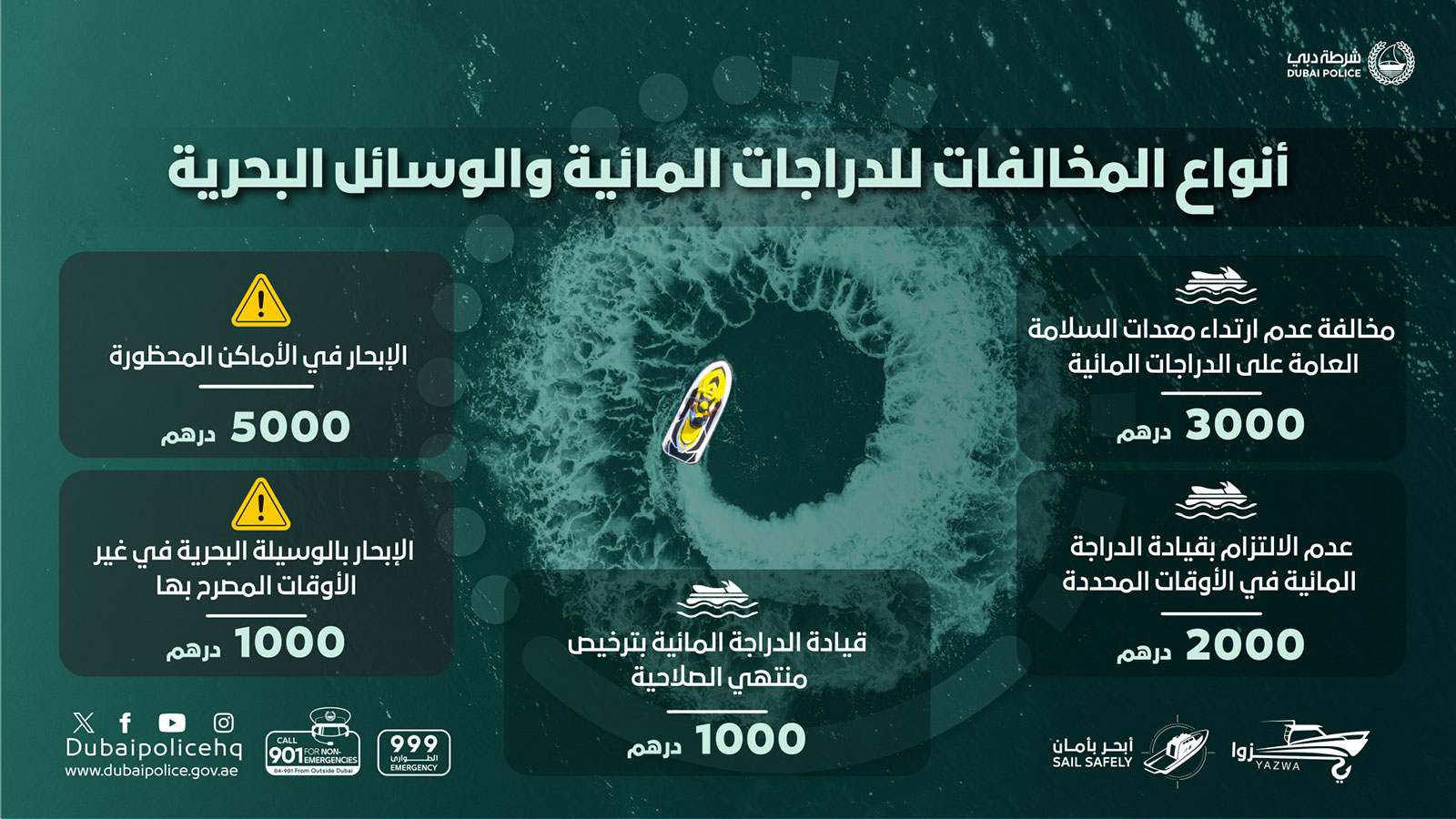 وأشار العميد حسن سهيل الى أن المخالفات المُتعلقة بالوسائل البحرية تنوعت بين استخدامها رغم انتهاء صلاحيتها وغرامتها تبلغ 1000 درهم، والإبحار في الأماكن المحظورة في الإمارة وغرامتها 5 آلاف درهم، والإبحار بالوسيلة البحرية في غير الأوقات المصرح بها وغرامتها 1000درهم.