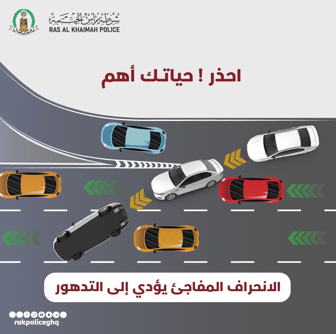 حذرّت القيادة العامة لشرطة رأس الخيمة، ممثلة في إدارة المرور والدوريات فرع التوعية والإعلام المروري، من مخاطر الانحراف المفاجئ ضمن حملتها المرورية الفرعية التي أطلقتها تحت شعار (احذر! حياتك أهم) مناشدة مستخدمي الطريق، بعدم الانشغال بغير الطريق أثناء القيادة تجنباً لحدوث الانحراف المفاجئ وتدهور المركبة وفقدان السيطرة على القيادة مما يؤدي إلى حدوث الحوادث المرورية المهلكة.