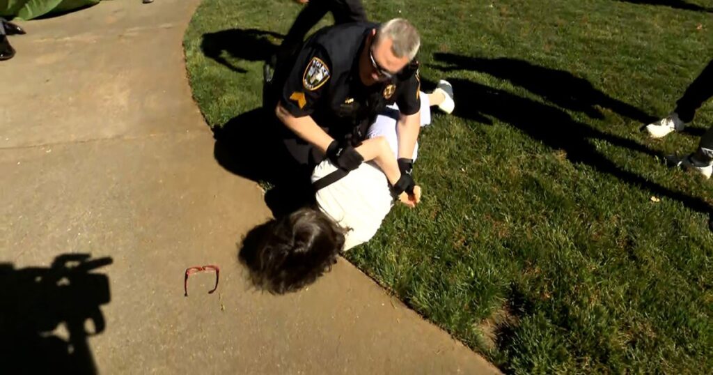 Emory’s Caroline Fohlin is knocked down by the police while shouting: “I’m a professor!!” Hear the disbelief in her voice. She never expected to be treated like this by her own university for protesting Israel’s slaughter.