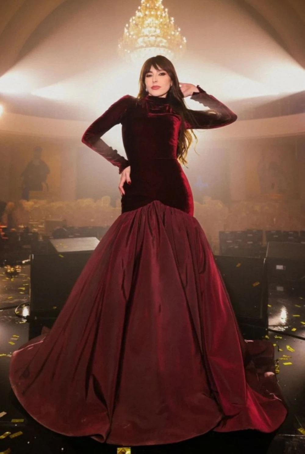 أناقة عبير نعمة والفستان البرغندي: تحليل لتصميم رامي كادي
