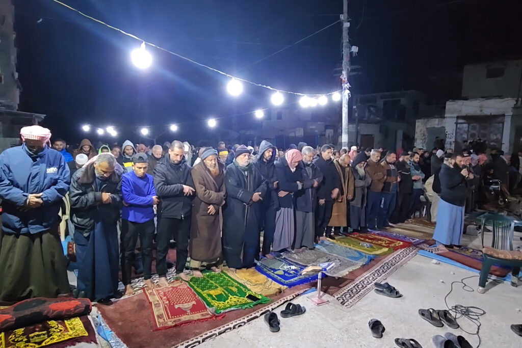 ورغم حزنه الشديد على ما حل بالمسجد، وأجواء البرد والرياح التي تشتد ليلا، فإن محمود يتحلى بعزيمة وإصرار شديدين بالمواظبة على حضور الصلوات، خاصة صلاة التراويح في الشوارع والساحات المحيطة بالمسجد.