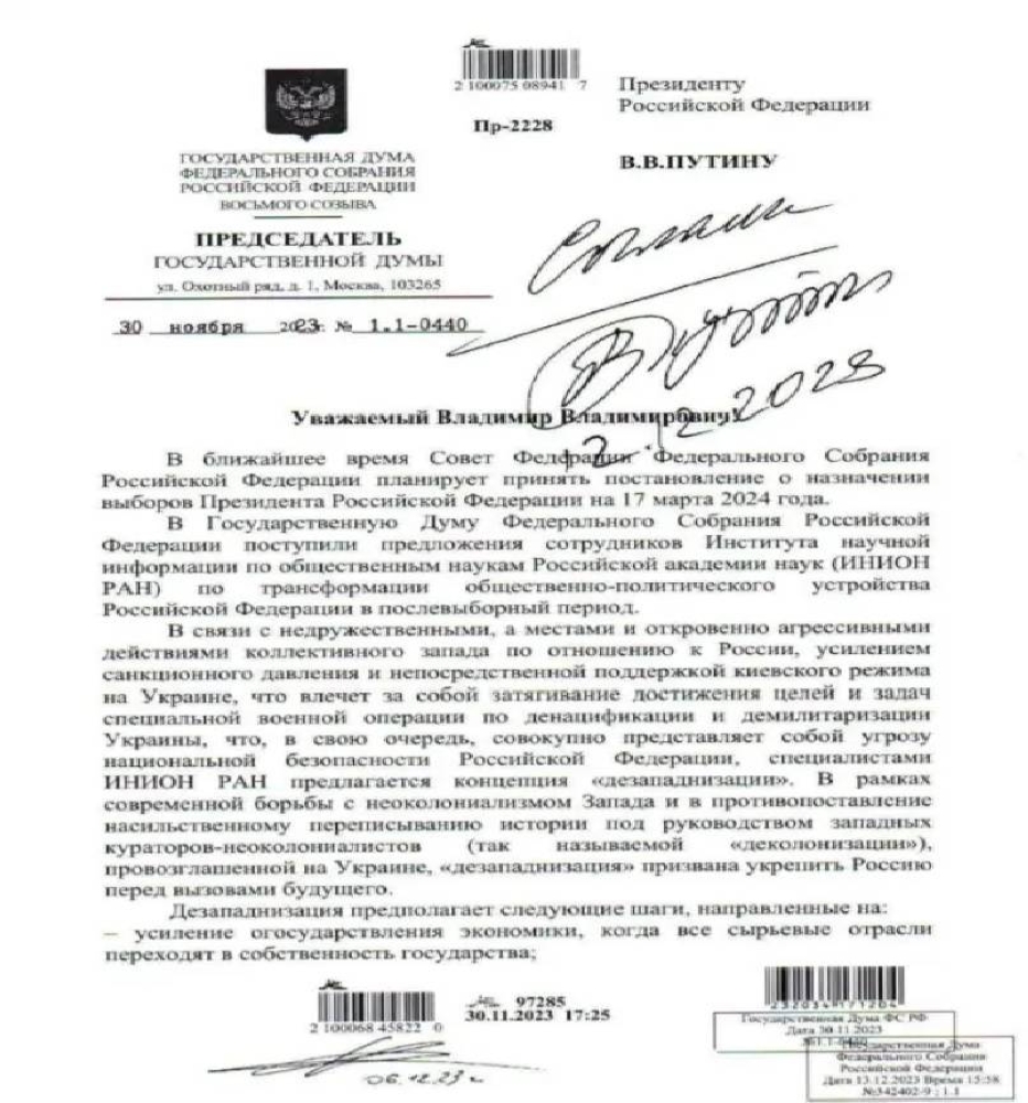ووفق نص الرسالة، فإنه «بعد انتهاء العملية العسكرية الخاصة في أوكرانيا وسقوط نظام كييف، فإن المواجهة بين روسيا والغرب لن تتوقف، بل ستشتد».