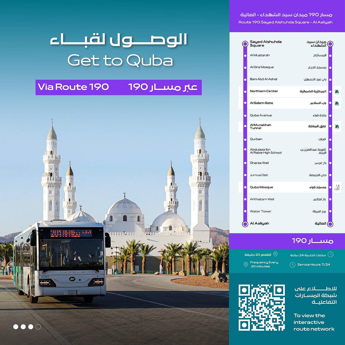 أعلنت هيئة تطوير منطقة المدينة المنورة ممثلةً في مشروع حافلات المدينة عن تسهيل الوصول إلى مسجد قباء، أول مسجد بُني في الإسلام، عبر مسارين رئيسيين ضمن شبكة النقل العام.