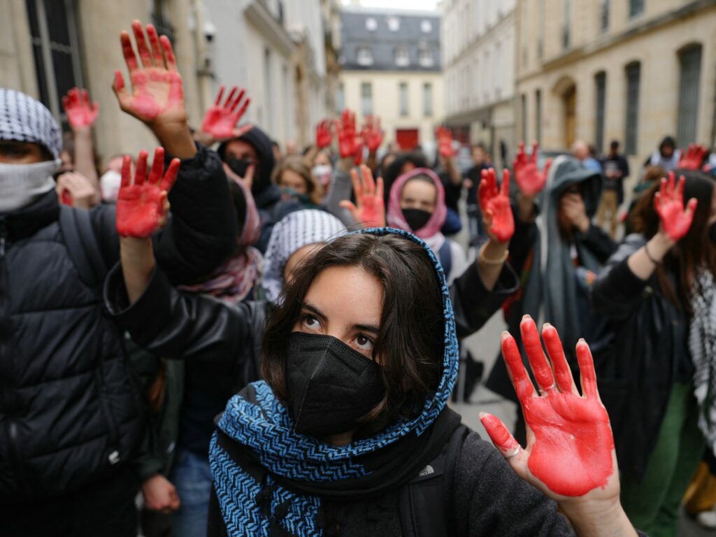 في معهد العلوم السياسية في باريس، أظهر ناشطون منددون بمجازر إسرائيل المستمرة في غزة، أيديهم مطلية باللون الأحمر، في إشارة إلى استمرار سفك دماء المدنيين الفلسطينيين تحت أنظار العالم.
