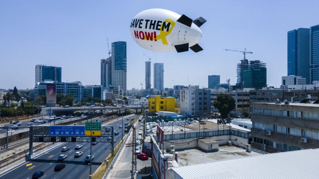 فيديو. “أنقذوهم الآن”.. إطلاق منطاد ضخم في سماء تل أبيب للمطالبة بالإفراج عن المحتجزين في غزة