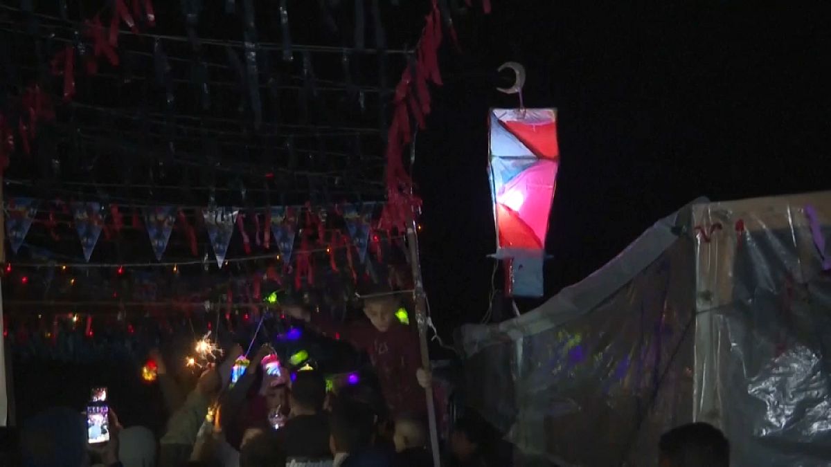 الرئيسية » فيديو. في استراحة لالتقاط الأنفاس.. فلسطينيون يعلقون زينة رمضان على خيام النزوح