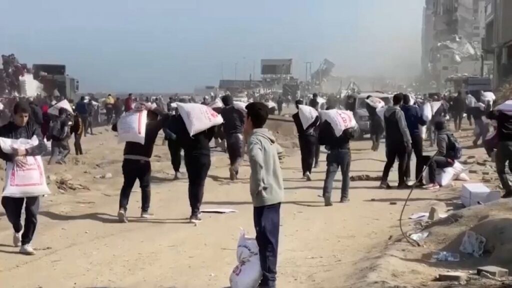 حاول مئات الفلسطينيين، الوصول إلى شاحنات تحمل طحينا، وسط تحذيرات أممية من مجاعة تلوح في الأفق.