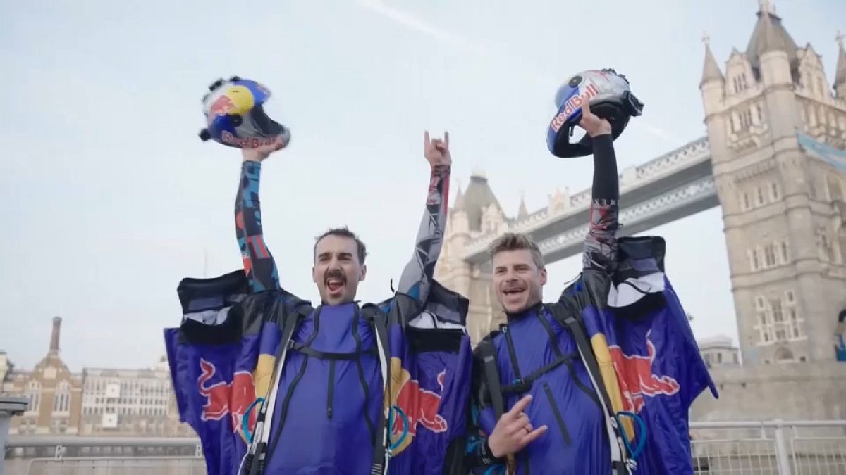 قفز ماركو فورست، 33 عاماً، وماركو فالتنسبيل، 39 عاماً، النمساويان من فريق ريد بول بالمظلات، من طائرة هليكوبتر على ارتفاع 3000 قدم صباح الأحد، وغطسا إلى ارتفاع 35 متراً فوق نهر التايمز. وقد حلقا عبر جسر البرج وأكملا مناورة معقدة تُعرف باسم “الشعلة”، ليرتفعا مرة أخرى إلى ارتفاع 80 متراً، وهو الارتفاع المطلوب لفتح مظلاتهما قبل الهبوط بأمان. واستغرقت الرحلة، منذ الإقلاع حتى الهبوط، 45 ثانية، وقطعت مسافة 1.2 كيلومتر ووصلت سرعتها القصوى إلى 246 كيلومترًا في الساعة.