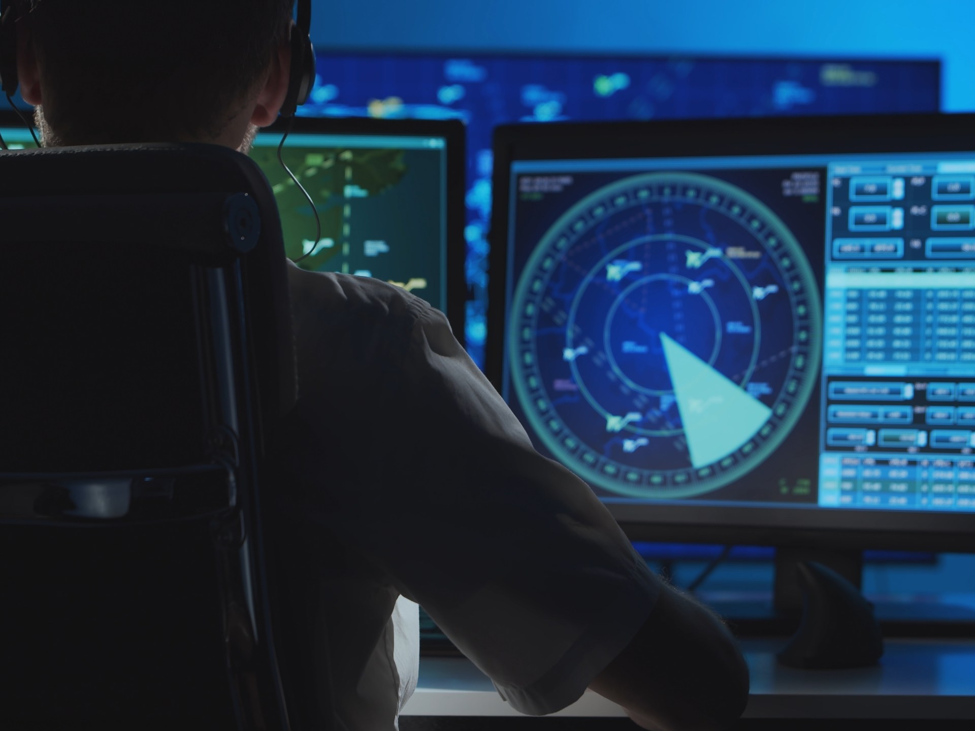 Federal anti terrorism command center with a big screen and radar surveillance used for reconnaissance on satellite system. Empty military control room transmitting mission oversight.