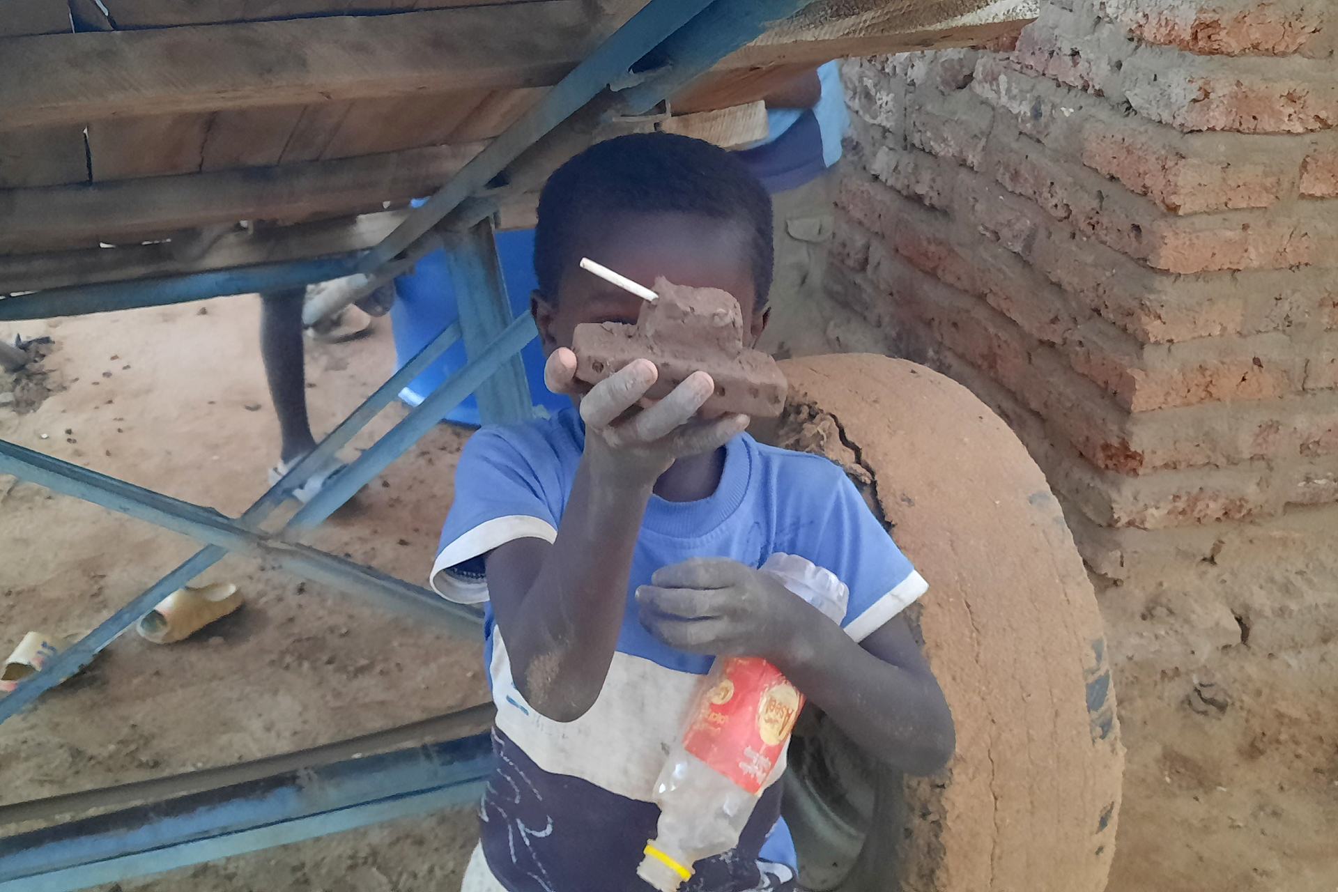أطفال نازحين بمنطقة شقرة غرب الفاشر وهم يلهون بأسلحة بدائية مصنوعة من الطين