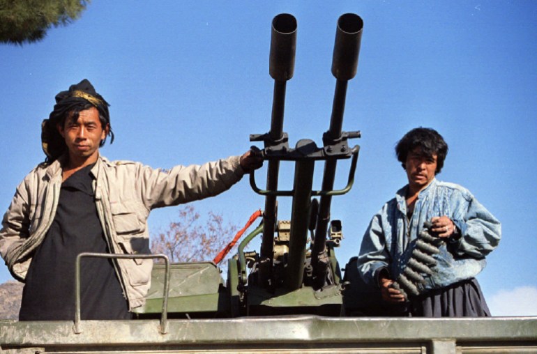 مقاتلون أفغان موالون لرئيس الحكومة الانتقالية حامد كرزاي على ظهر دبابة سوفياتية خارج لوغار ما بين العاصمة كابل وغارديز
