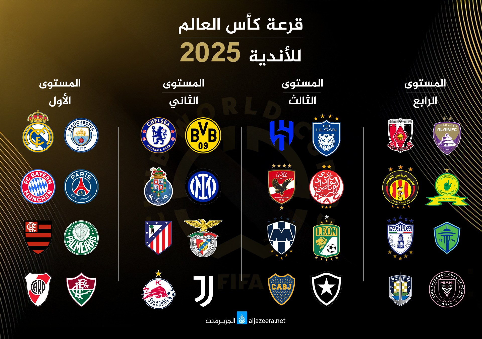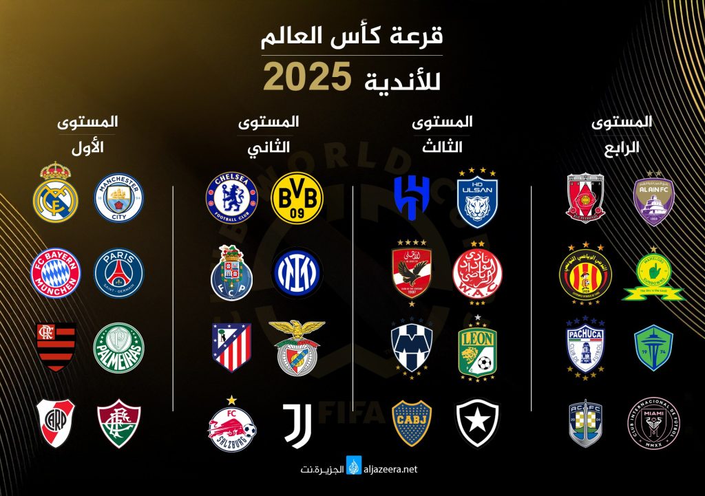 تقام قرعة كأس العالم للأندية لكرة القدم 2025 اليوم الخميس 5 ديسمبر/كانون الأول الحالي في ميامي بالولايات المتحدة، وتنطلق في الساعة السادسة مساء (18:00) بتوقيت غرينتش، التاسعة مساء (21:00) بتوقيت مكة المكرمة والدوحة وبغداد، العاشرة مساء (22:00) بتوقيت أبوظبي، السابعة مساء (19:00) بتوقيت تونس والمغرب والجزائر.