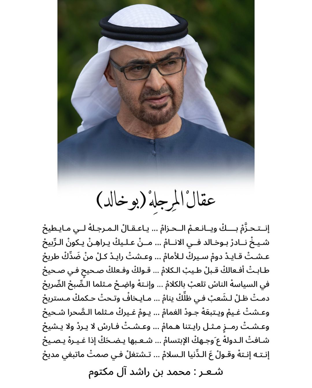 «عقال المرجله (بو خالد)»، التي نشرها سموه، أمس، على حسابه في «إنستغرام»، محتفياً في عوالمها بسيرة ومناقب قائد حكيم همام، عزيز الفعل والقول، يردد العالم قصص مفاخره، إذ يبرز في الساحات والأوقات كافة، كما تصف الأبيات سموه بأنه خير ربان وسند وعون لشعبه، وعنواناً للإقدام، وسيد المرجلة، وحامي حمى الديار، الذي يسطر بفِعاله أمجاداً وضاءة لا مثيل لها، يجسد معها ألمع نماذج الفروسية والإباء، فسموه معقل الأمان والآمال، ومن يلوذ به ويراهن على التوفيق والاطمئنان والخير في كنفه، وفي ظل رعايته وحماه، هو بلا شك فائز ميمون.
