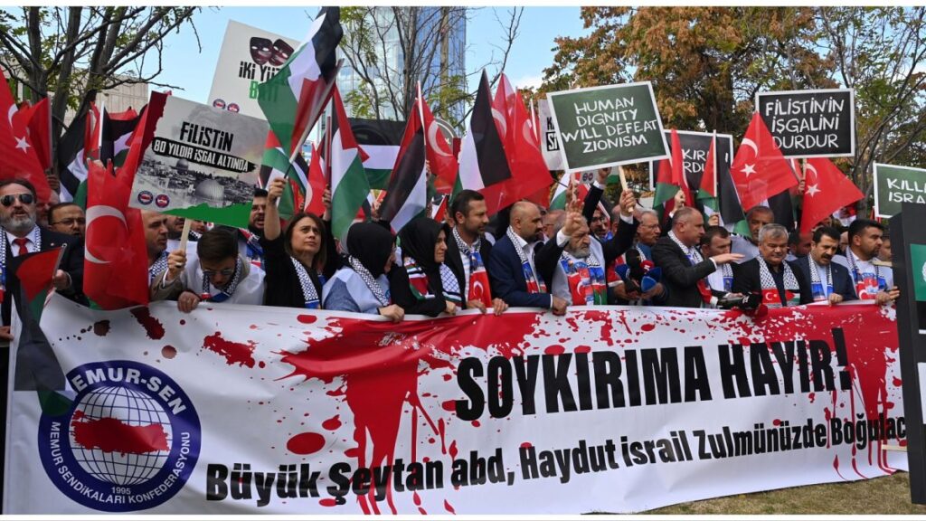 ورفع الأطباء الذين ارتدوا البالطوهات البيضاء الملطخة بالدماء لافتات مؤيدة للفلسطينيين، وعبارات تستنكر ما وصفوه بـ “مجازر إسرائيل”.