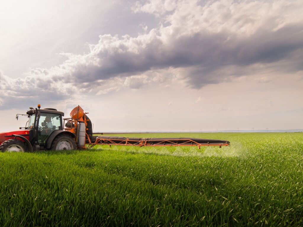 a mezőgazdasági termelők védőruházatot viselő búzamezőn permeteznek növényvédő szert