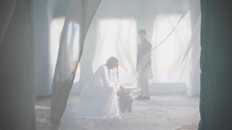 وهنالك يتلاقى القوس الافتتاحي للفيلم بما يوازيه من قوس مقابل، حيث الامتزاج بين خطي الفيلم؛ الواقعي والغرائبي، وفي هذا الإطار نرى أحمد يلتقي ليلى، ويدور حولها كالمولوية في مشهد متخيل.