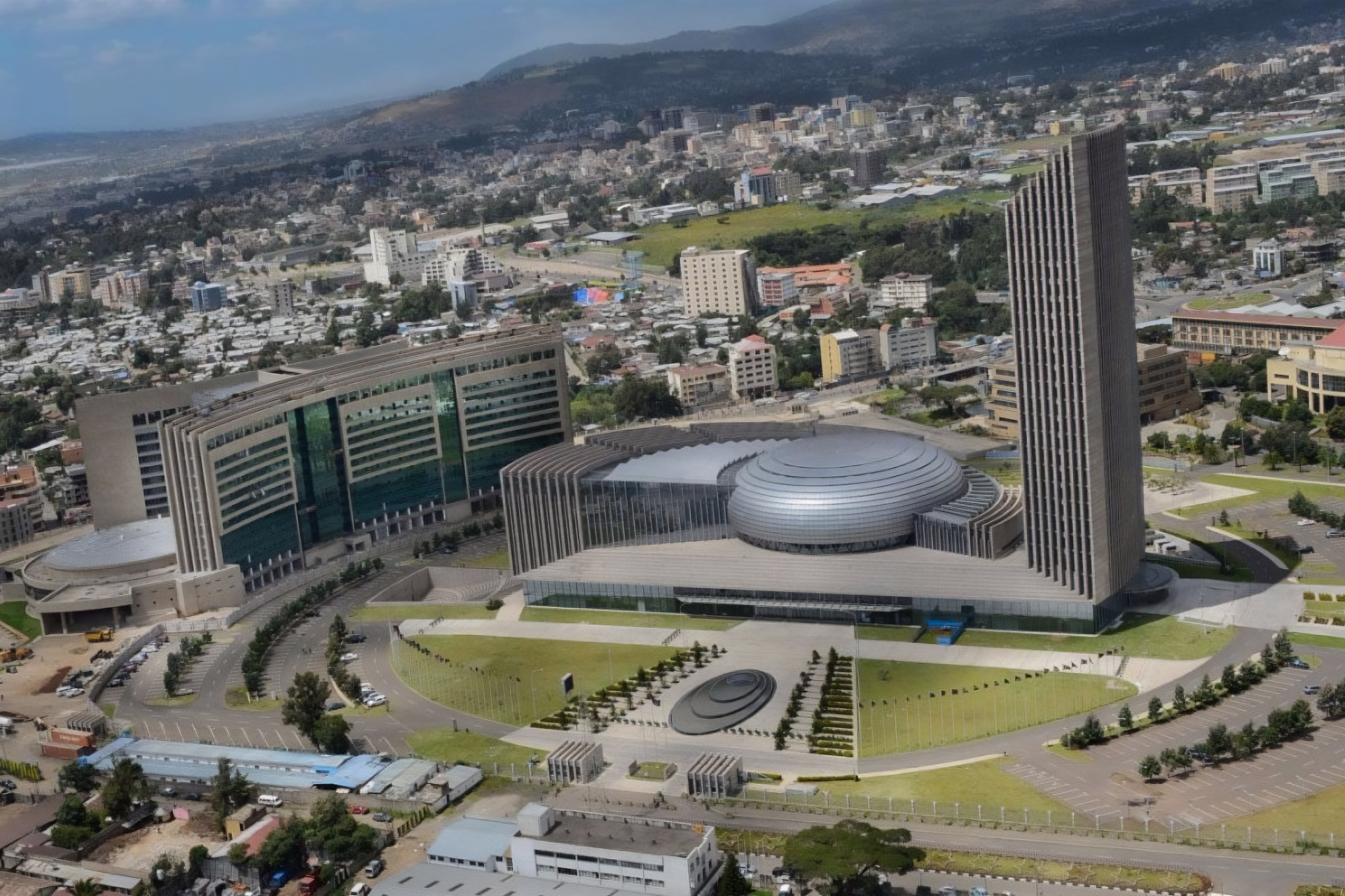 ويضم هذا المقر -الذي شيد عام 2012 بتمويل أساسي من قبل الحكومة الصينية- ثاني أعلى مبنى في البلاد، إضافة إلى مبان فرعية وعشرات المكاتب وقاعات المؤتمرات، أكبرها صالة باسم الزعيم الجنوب الأفريقي نيلسون مانديلا.