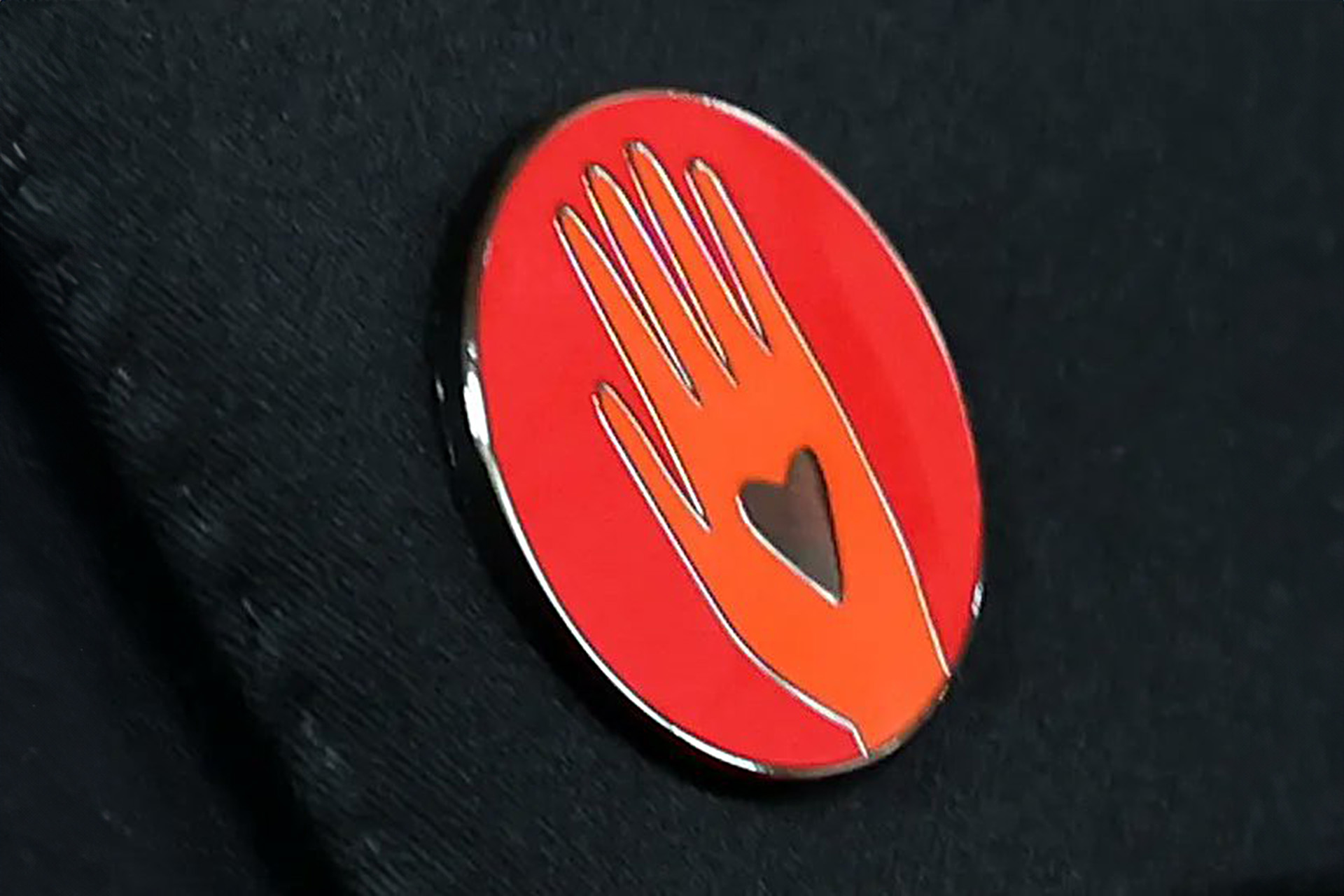 يتميز الدبوس بتصميم بسيط لكنه قوي، حيث يتكون من دائرة حمراء بها يد مفتوحة مخططة بالأسود وقلب برتقالي في وسطها.