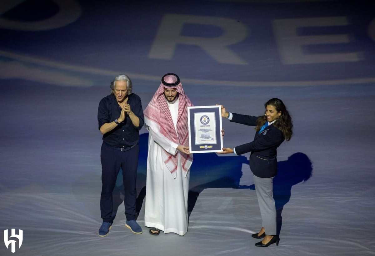 كرمت موسوعة «جينيس» للأرقام القياسية نادي الهلال لكسر رقم عالمي بتحقيقه 34 فوزًا متتاليًا خلال موسم 2024/23، خلال حفل تتويج النادي بلقب دوري روشن السعودي، لموسم 2023-24، على ملعب «المملكة أرينا» بالرياض، اليوم الجمعة.