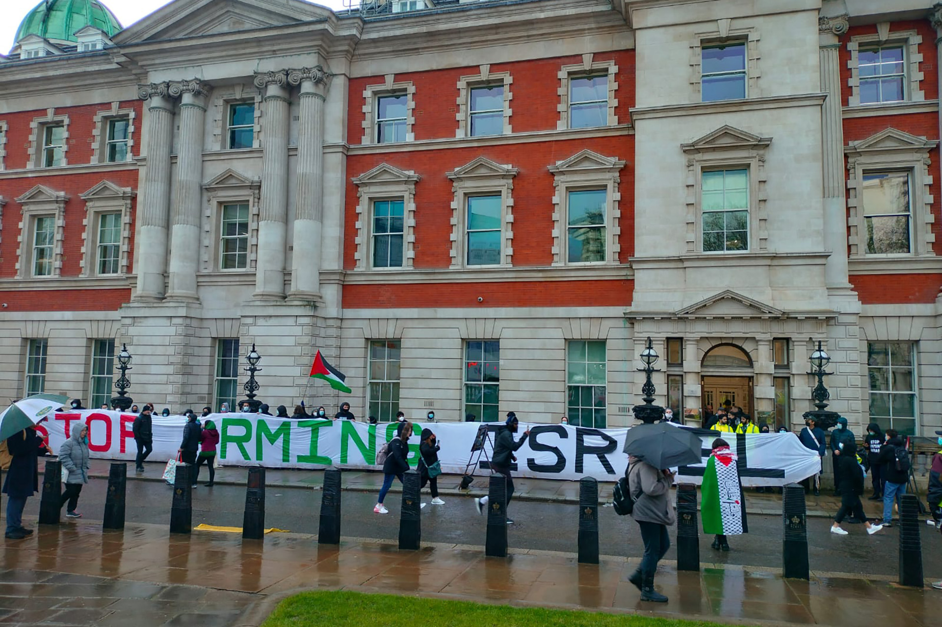 الرئيسية » نشطاء يحاصرون وزارة الأعمال البريطانية احتجاجًا على تسليح إسرائيل