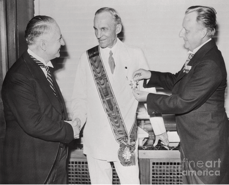 لم يكن خفيا أن “هنري فورد” كان معجبا بألمانيا النازية، وعارض دخول الولايات المتحدة الأمريكية في الحرب، وفي يوليو/ تموز 1938، قبِل “فورد” أن يتقلد أعلى وسام تمنحه ألمانيا النازية لأجنبي. وفي الشهر التالي، نال أحد كبار المسؤولين التنفيذيين في شركة “جنرال موتورز” ميدالية مماثلة، وهو “جيمس موني”، وذلك تقديرا “لخدمته المتميزة للرايخ”.