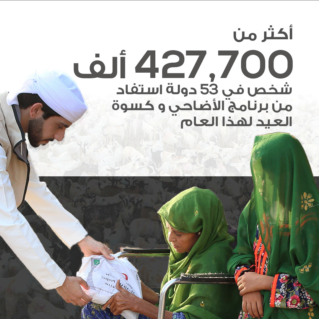 نفذت هيئة الهلال الأحمر الإماراتي، مشروع الأضاحي هذا العام داخل الإمارات وفي 53 دولة حول العالم، حيث استفاد من المشروع أكثر من 100 ألف شخص داخل الدولة، و400 ألف في 4 قارات، إلى جانب 27 ألفا و700 شخص استفادوا من برنامج كسوة العيد خارج الدولة. وشمل مشروع أضاحي الهلال الأحمر 53 دولة في أفريقيا وآسيا وأوروبا وأمريكا الجنوبية.