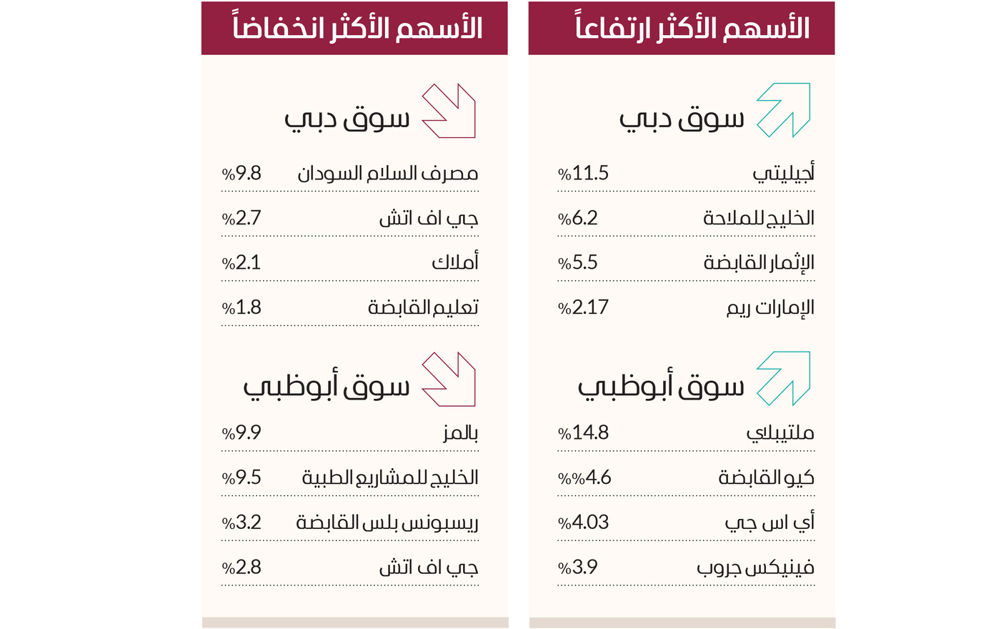 في المقابل استعاد سوق أبوظبي النشاط مرة أخرى استناداً لارتفاع سهم «ملتيبلاي» 14.8%، ثم سهم «كيو القابضة» بنسبة بلغت 4.6% تلاهما سهم «أي اس جي» بنسبة 4.03% بينما حقق سهم «فينكس جروب» نسبة ارتفاع 3.9%.