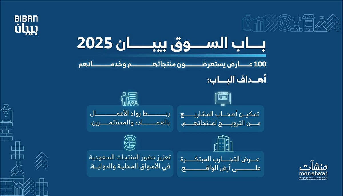 يحتضن ملتقى “بيبان 2025″، الذي تنظمه الهيئة العامة للمنشآت الصغيرة والمتوسطة “منشآت” خلال الفترة من 5 إلى 8 نوفمبر المقبل في مركز واجهة الرياض للمعارض والمؤتمرات، تحت شعار “وجهة عالمية للفرص”، أكثر من (100) عارض من رواد الأعمال وأصحاب المنشآت الصغيرة والمتوسطة من داخل المملكة وخارجها ضمن ” باب السوق”.