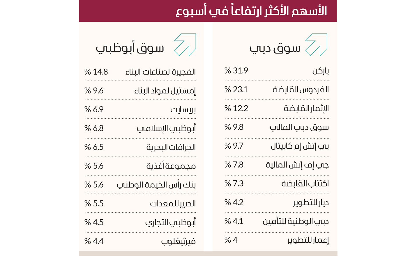 وصعد سهم باركن 31.9% في جلستين، وفي أسبوع ارتفعت أسهم الفردوس القابضة 23.1%، والإثمار القابضة 12.2%، وسوق دبي المالي 9.8%، وبي إتش إم كابيتال 9.7%، وجي إف إتش المالية 7.8%، واكتتاب القابضة 7.3%، وزاد ديار للتطوير 4.2%، ودبي الوطنية للتأمين 4.1%، وإعمار للتطوير 4%، ودبي للاستثمار 3.5%، وأمانات القابضة 3.9%، والاتحاد العقارية 3%.